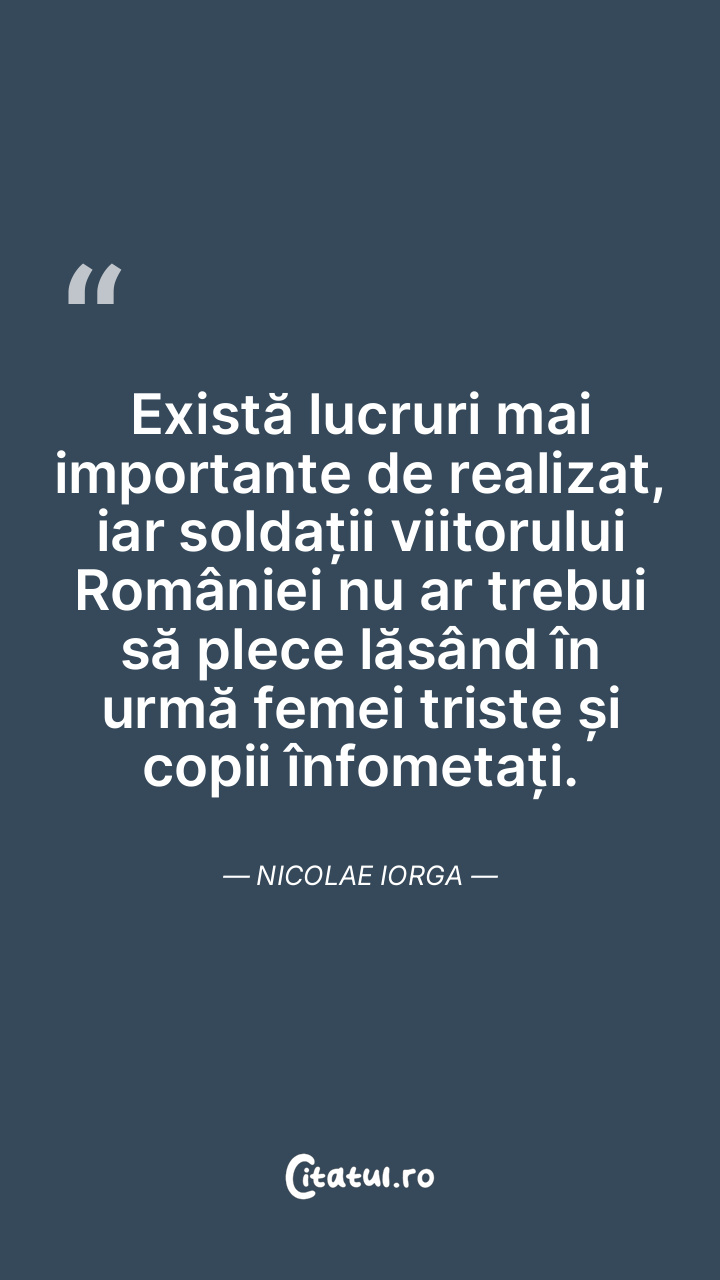 Există lucruri mai importante de realizat, iar soldații viitorului României nu ar trebui să plece lăsând în urmă femei triste și copii înfometați. Nicolae Iorga