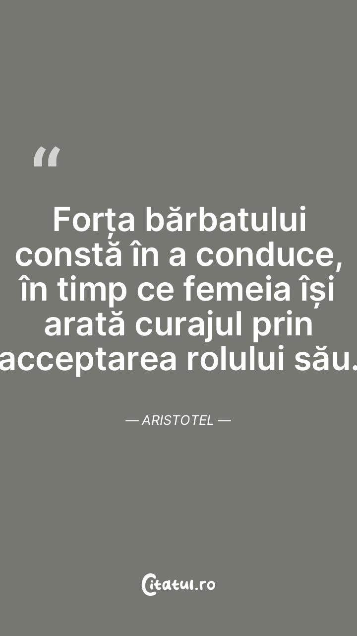 Forța bărbatului constă în a conduce, în timp ce femeia își arată curajul prin acceptarea rolului său. Aristotel