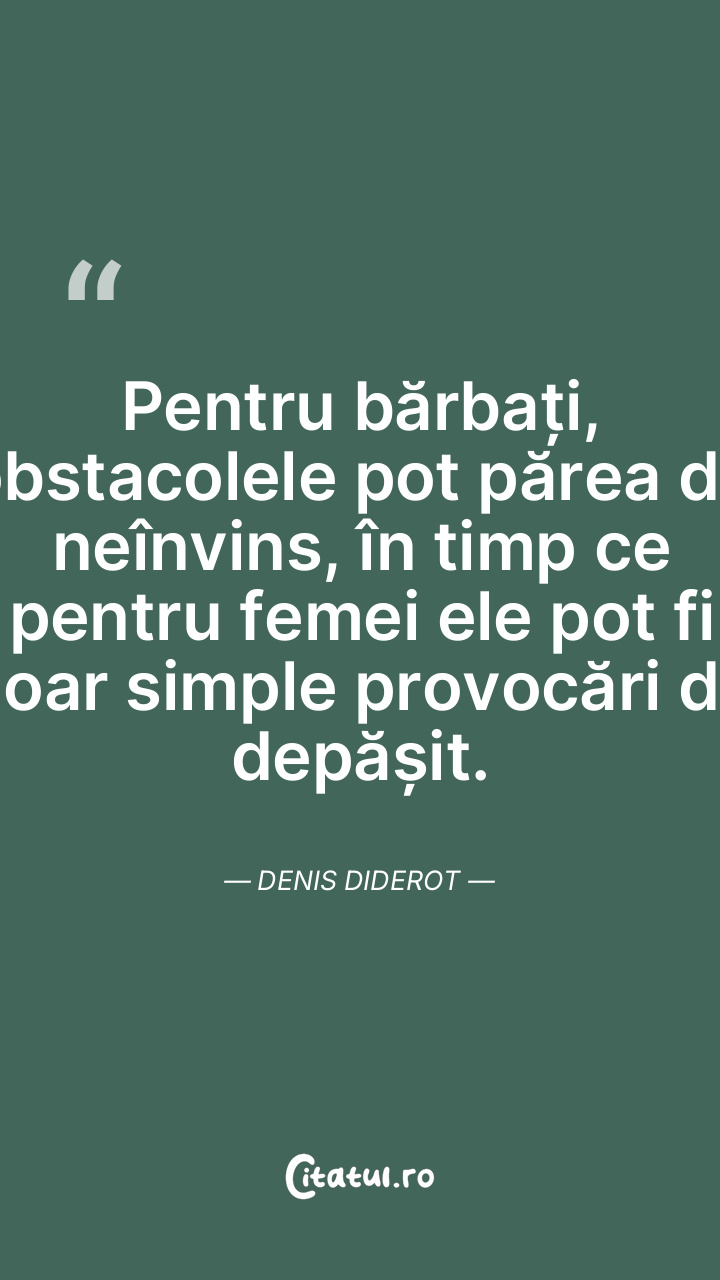 Pentru bărbați, obstacolele pot părea de neînvins, în timp ce pentru femei ele pot fi doar simple provocări de depășit. Denis Diderot
