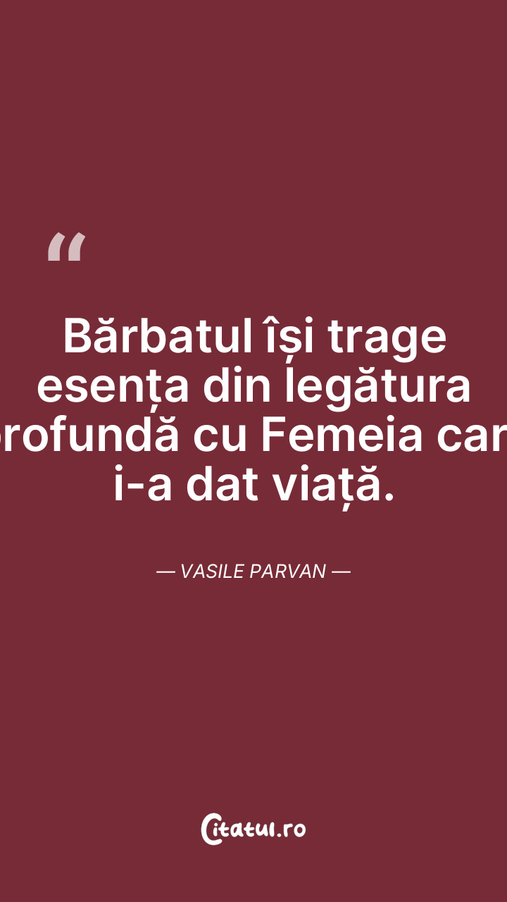 Bărbatul își trage esența din legătura profundă cu Femeia care i-a dat viață. Vasile Parvan