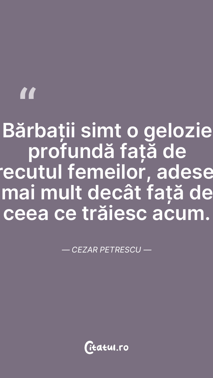 Bărbații simt o gelozie profundă față de trecutul femeilor, adesea mai mult decât față de ceea ce trăiesc acum. Cezar Petrescu