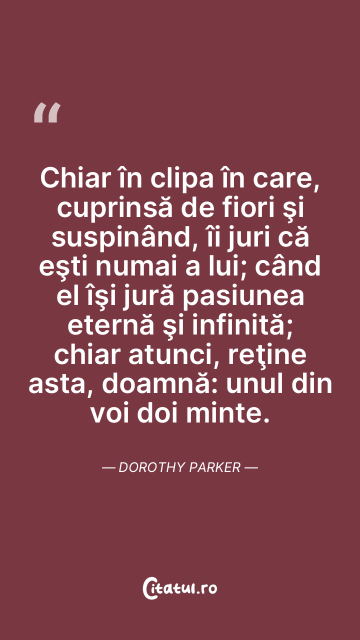 Chiar în clipa în care, cuprinsă de fiori şi suspinând, îi juri că eşti numai a lui; când el îşi jură pasiunea eternă şi infinită; chiar atunci, reţine asta, doamnă: unul din voi doi minte. Dorothy Parker