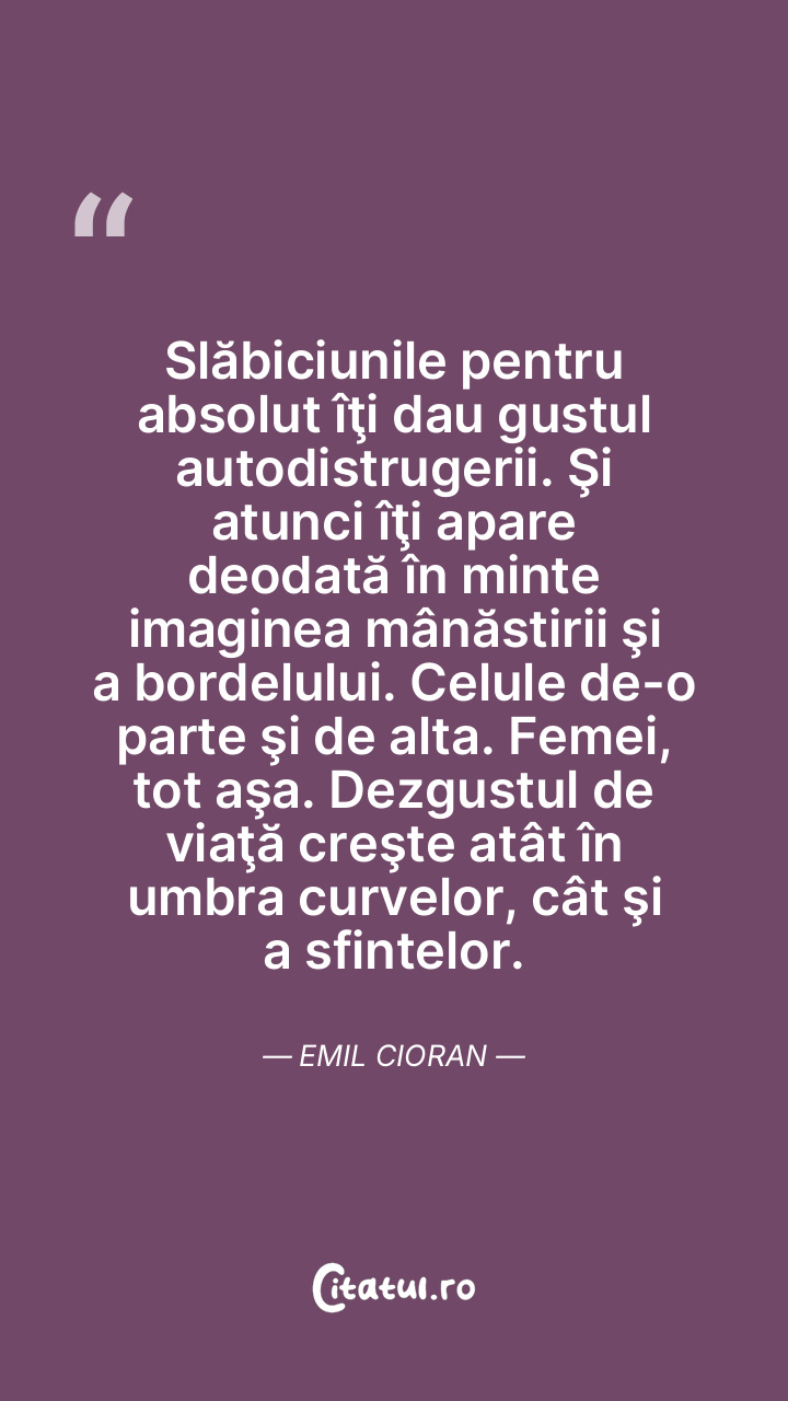 Slăbiciunile pentru absolut îţi dau gustul autodistrugerii. Şi atunci îţi apare deodată în minte imaginea mânăstirii şi a bordelului. Celule de-o parte şi de alta. Femei, tot aşa. Dezgustul de viaţă creşte atât în umbra curvelor, cât şi a sfintelor. Emil Cioran