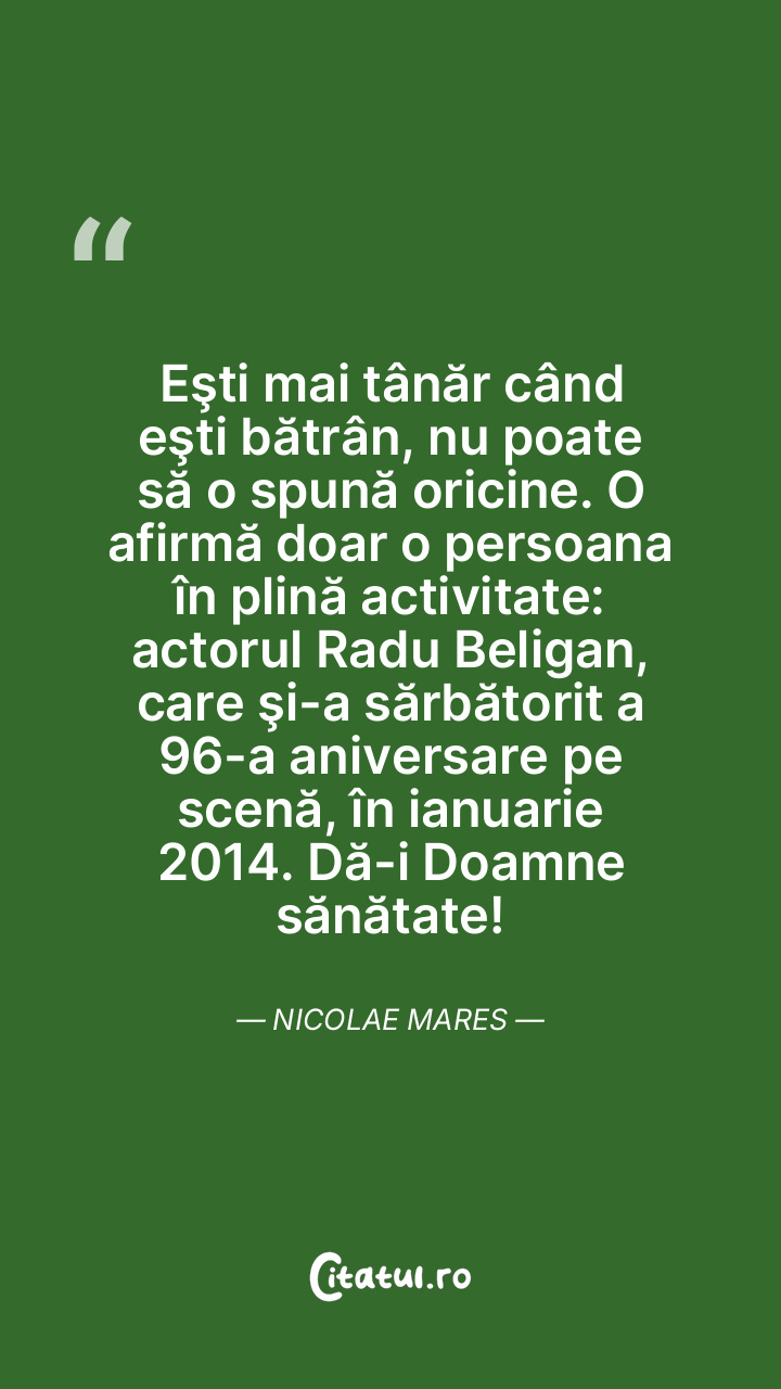 Eşti mai tânăr când eşti bătrân, nu poate să o spună oricine. O afirmă doar o persoana în plină activitate: actorul Radu Beligan, care şi-a sărbătorit a 96-a aniversare pe scenă, în ianuarie 2014. Dă-i Doamne sănătate! Nicolae Mares
