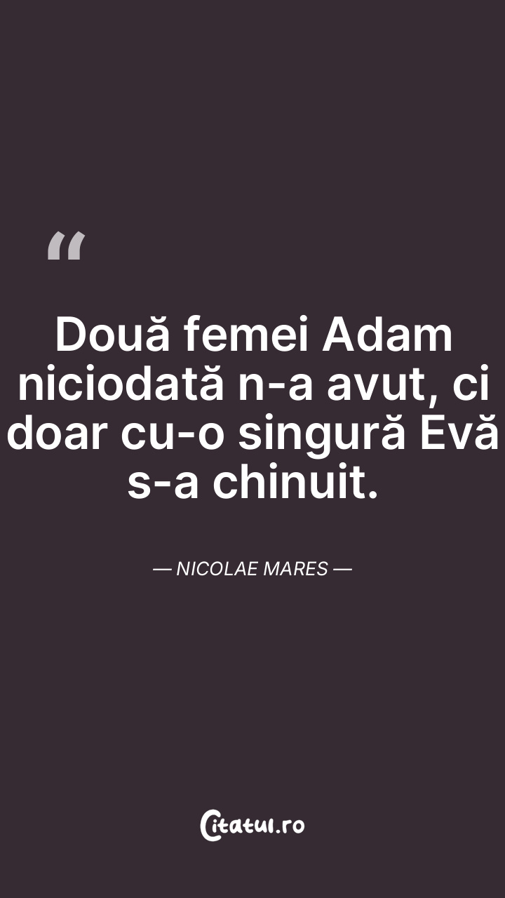 Două femei Adam niciodată n-a avut, ci doar cu-o singură Evă s-a chinuit. Nicolae Mares