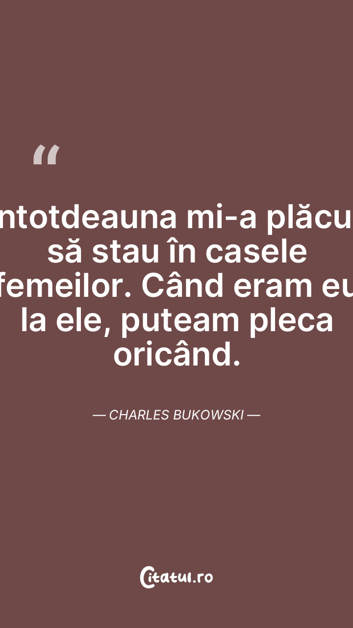 Întotdeauna mi-a plăcut să stau în casele femeilor. Când eram eu la ele, puteam pleca oricând. Charles Bukowski
