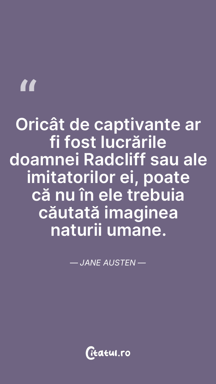 Oricât de captivante ar fi fost lucrările doamnei Radcliff sau ale imitatorilor ei, poate că nu în ele trebuia căutată imaginea naturii umane. Jane Austen