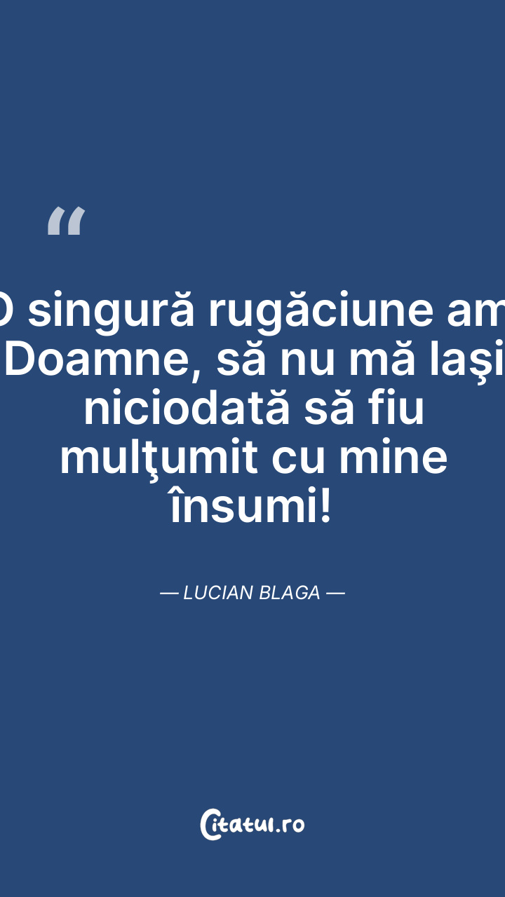 O singură rugăciune am: Doamne, să nu mă laşi niciodată să fiu mulţumit cu mine însumi! Lucian Blaga