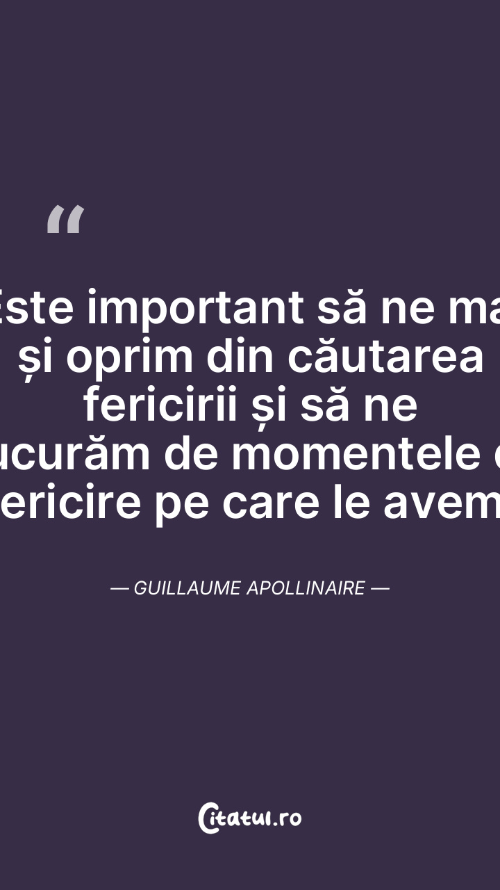 Este important să ne mai și oprim din căutarea fericirii și să ne bucurăm de momentele de fericire pe care le avem. Guillaume Apollinaire