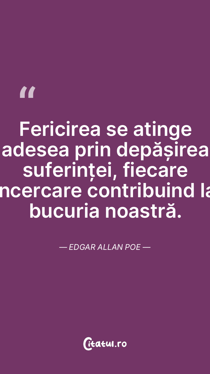 Fericirea se atinge adesea prin depășirea suferinței, fiecare încercare contribuind la bucuria noastră. Edgar Allan Poe