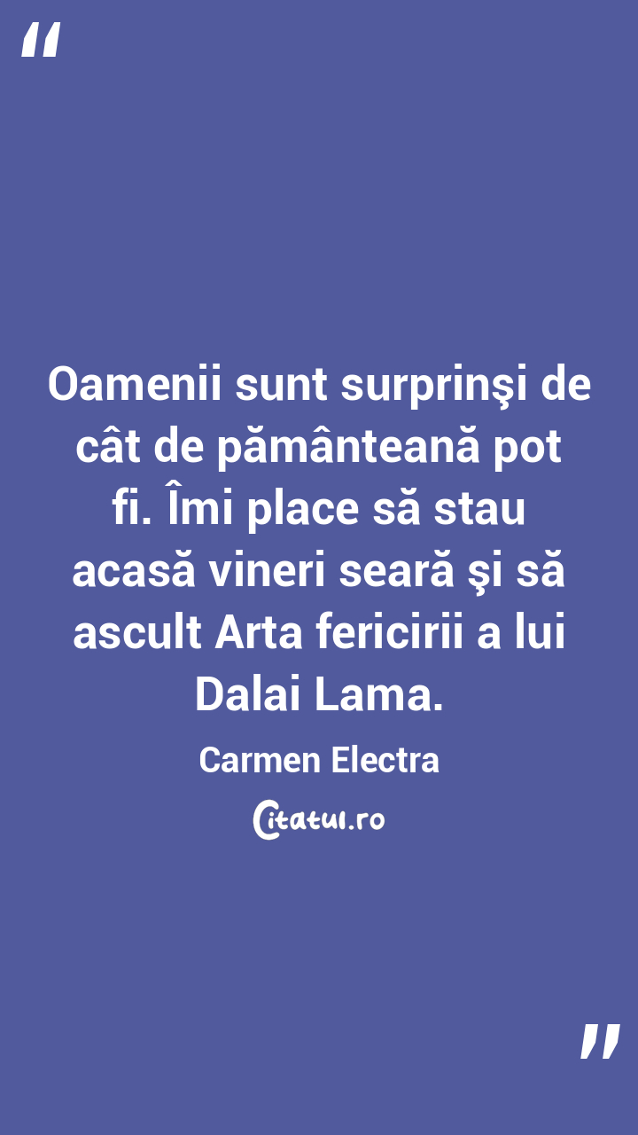Oamenii sunt surprinşi de cât de pământeană pot fi. Îmi place să stau acasă vineri seară şi să ascult Arta fericirii a lui Dalai Lama. Carmen Electra