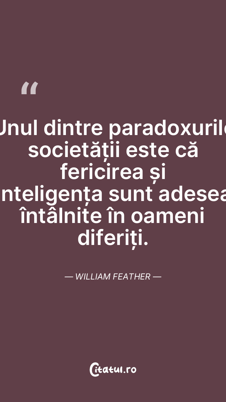 Unul dintre paradoxurile societății este că fericirea și inteligența sunt adesea întâlnite în oameni diferiți. William Feather