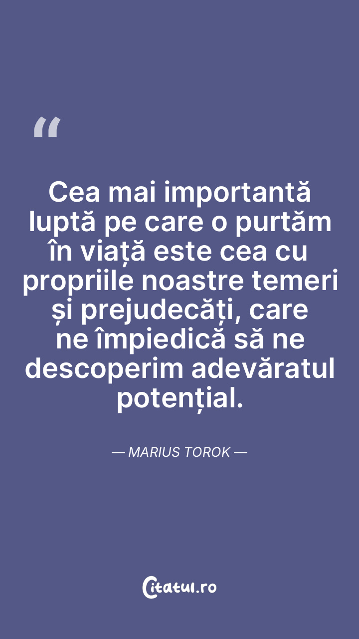 Cea mai importantă luptă pe care o purtăm în viață este cea cu propriile noastre temeri și prejudecăți, care ne împiedică să ne descoperim adevăratul potențial. Marius Torok