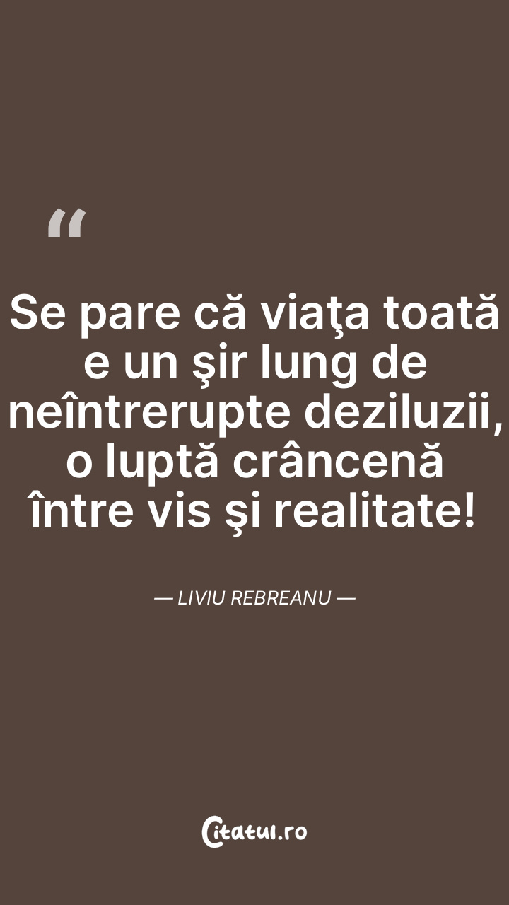 Se pare că viaţa toată e un şir lung de neîntrerupte deziluzii, o luptă crâncenă între vis şi realitate! Liviu Rebreanu