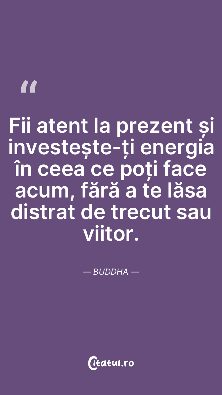 Fii atent la prezent și investește-ți energia în ceea ce poți face acum, fără a te lăsa distrat de trecut sau viitor. Buddha