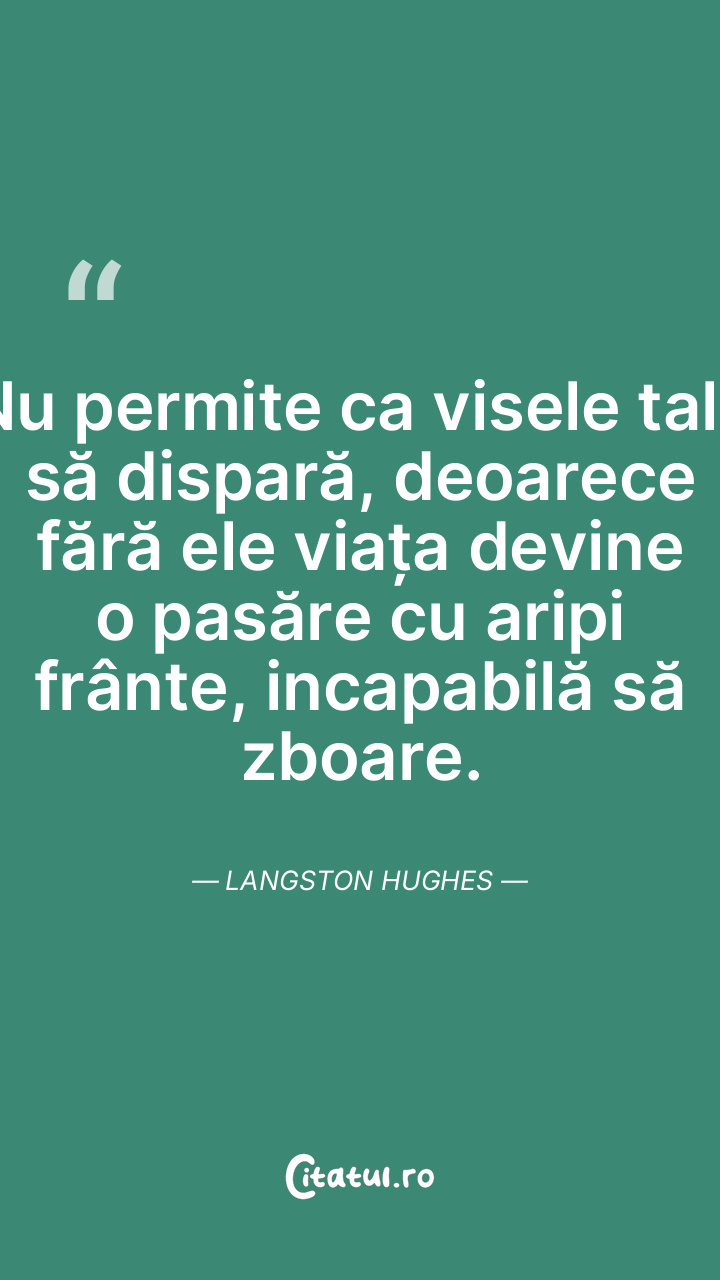 Nu permite ca visele tale să dispară, deoarece fără ele viața devine o pasăre cu aripi frânte, incapabilă să zboare. Langston Hughes