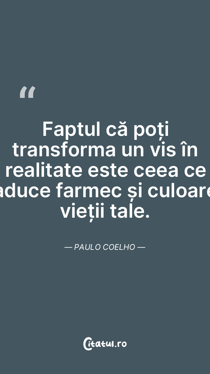 Faptul că poți transforma un vis în realitate este ceea ce aduce farmec și culoare vieții tale. Paulo Coelho