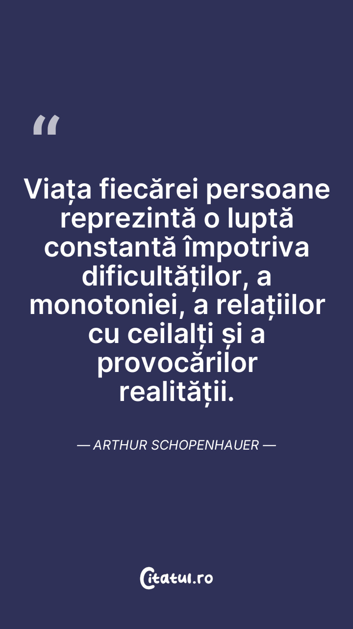Viața fiecărei persoane reprezintă o luptă constantă împotriva dificultăților, a monotoniei, a relațiilor cu ceilalți și a provocărilor realității. Arthur Schopenhauer