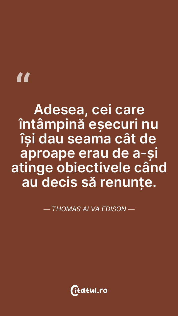 Adesea, cei care întâmpină eșecuri nu își dau seama cât de aproape erau de a-și atinge obiectivele când au decis să renunțe. Thomas Alva Edison
