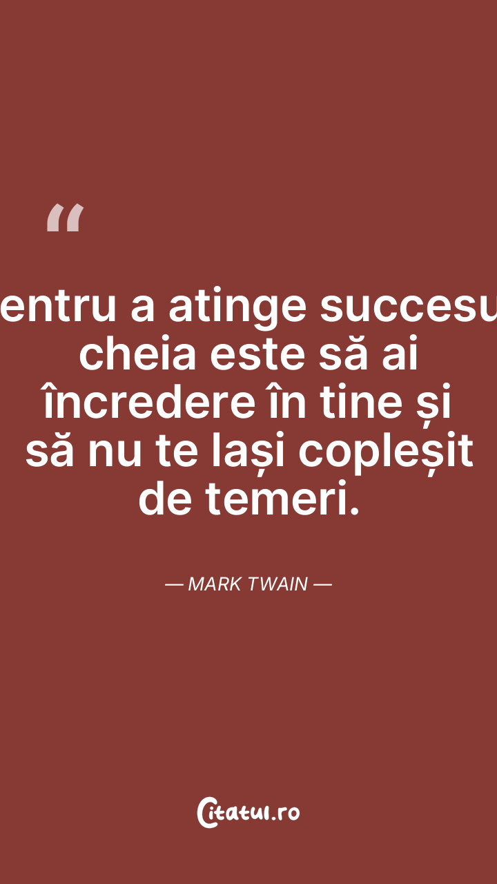 Pentru a atinge succesul, cheia este să ai încredere în tine și să nu te lași copleșit de temeri. Mark Twain