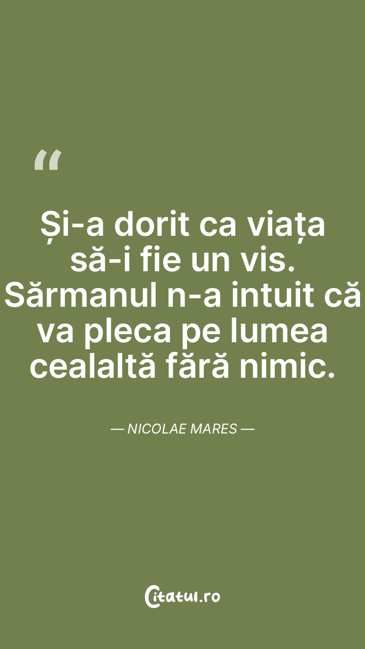 Și-a dorit ca viața să-i fie un vis. Sărmanul n-a intuit că va pleca pe lumea cealaltă fără nimic. Nicolae Mares