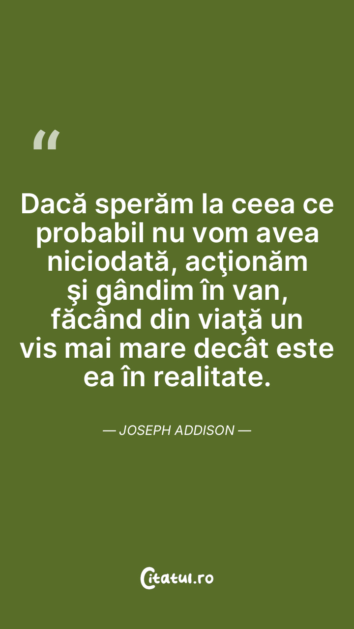 Dacă sperăm la ceea ce probabil nu vom avea niciodată, acţionăm şi gândim în van, făcând din viaţă un vis mai mare decât este ea în realitate. Joseph Addison