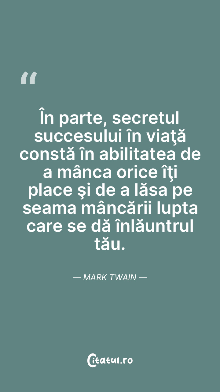 În parte, secretul succesului în viaţă constă în abilitatea de a mânca orice îţi place şi de a lăsa pe seama mâncării lupta care se dă înlăuntrul tău. Mark Twain