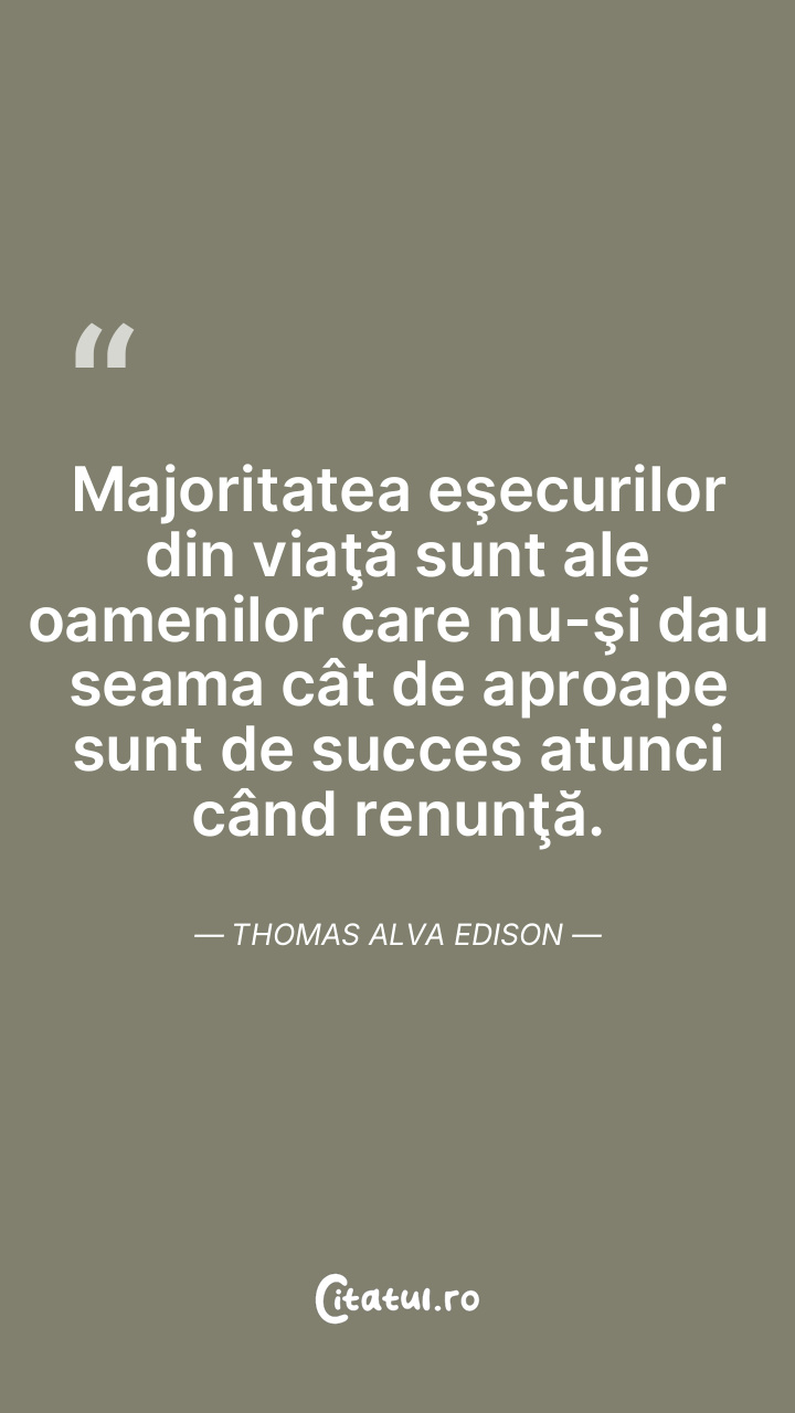 Majoritatea eşecurilor din viaţă sunt ale oamenilor care nu-şi dau seama cât de aproape sunt de succes atunci când renunţă. Thomas Alva Edison