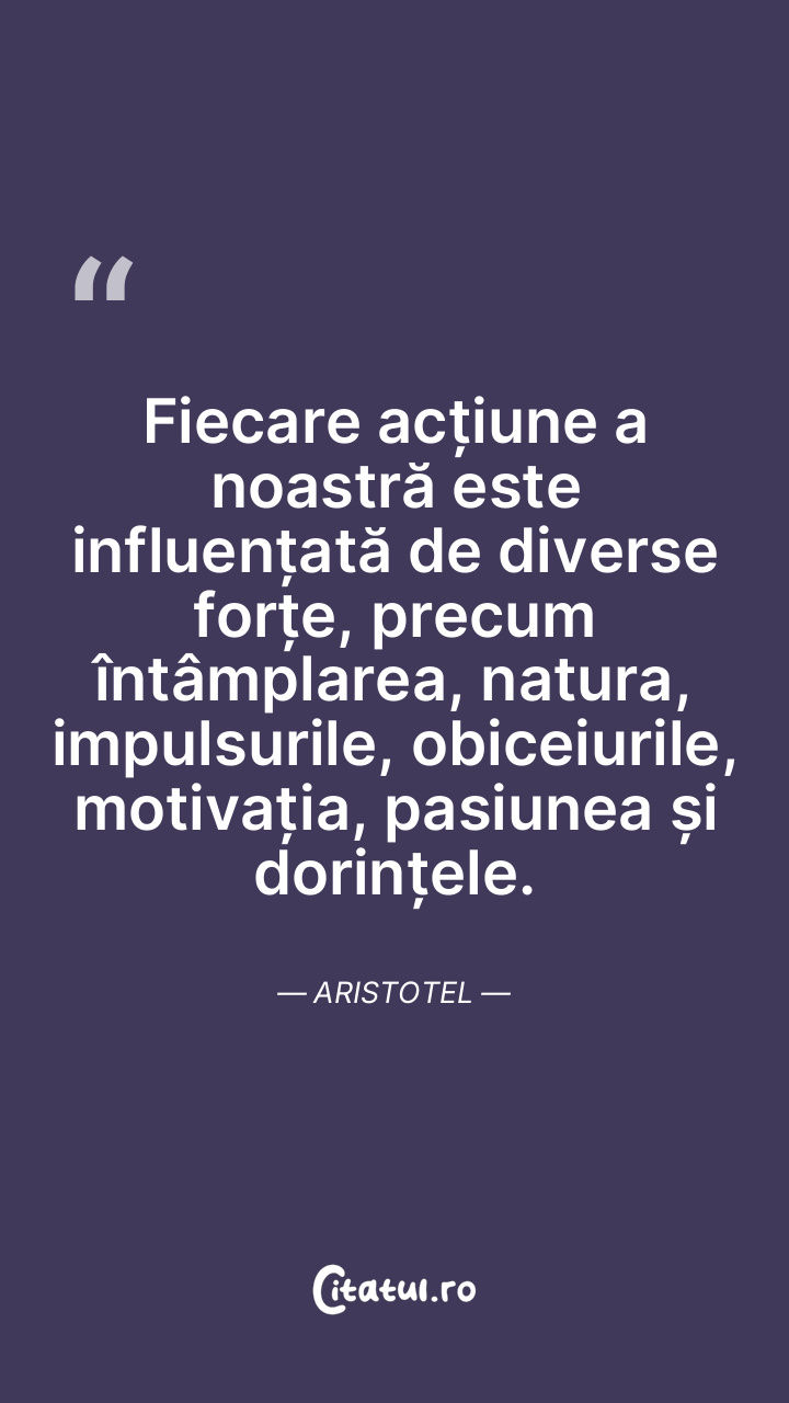 Fiecare acțiune a noastră este influențată de diverse forțe, precum întâmplarea, natura, impulsurile, obiceiurile, motivația, pasiunea și dorințele. Aristotel