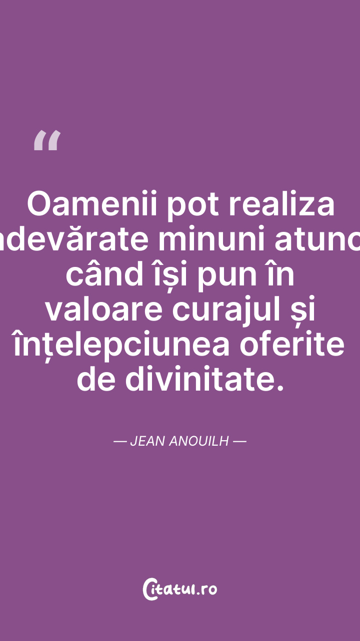 Oamenii pot realiza adevărate minuni atunci când își pun în valoare curajul și înțelepciunea oferite de divinitate. Jean Anouilh
