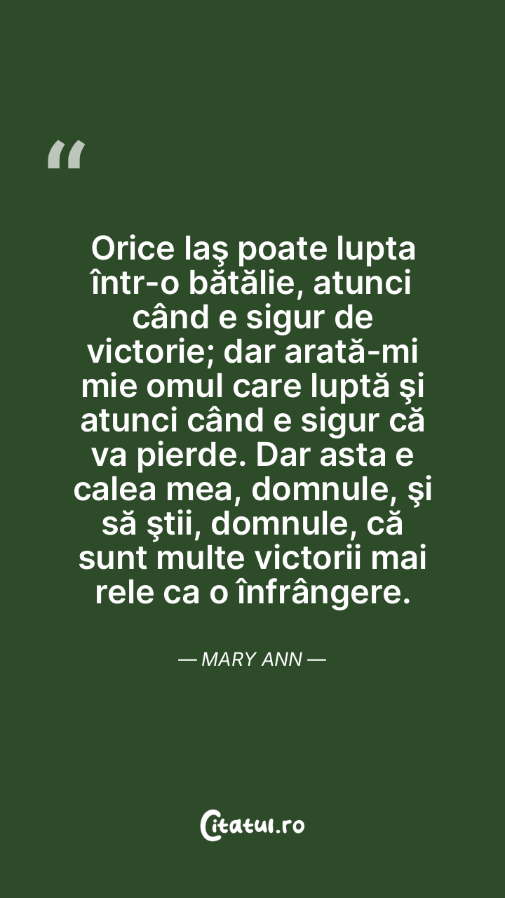 Orice laş poate lupta într-o bătălie, atunci când e sigur de victorie; dar arată-mi mie omul care luptă şi atunci când e sigur că va pierde. Dar asta e calea mea, domnule, şi să ştii, domnule, că sunt multe victorii mai rele ca o înfrângere. Mary Ann