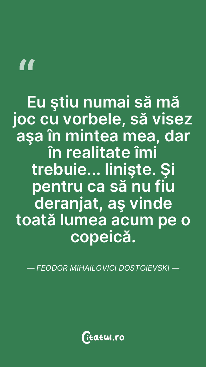 Eu ştiu numai să mă joc cu vorbele, să visez aşa în mintea mea, dar în realitate îmi trebuie... linişte. Şi pentru ca să nu fiu deranjat, aş vinde toată lumea acum pe o copeică. Feodor Mihailovici Dostoievski