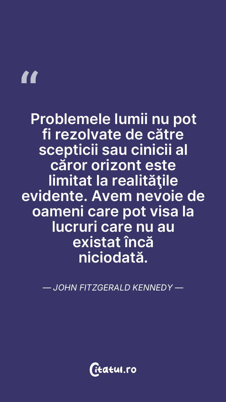 Problemele lumii nu pot fi rezolvate de către scepticii sau cinicii al căror orizont este limitat la realităţile evidente. Avem nevoie de oameni care pot visa la lucruri care nu au existat încă niciodată. John Fitzgerald Kennedy