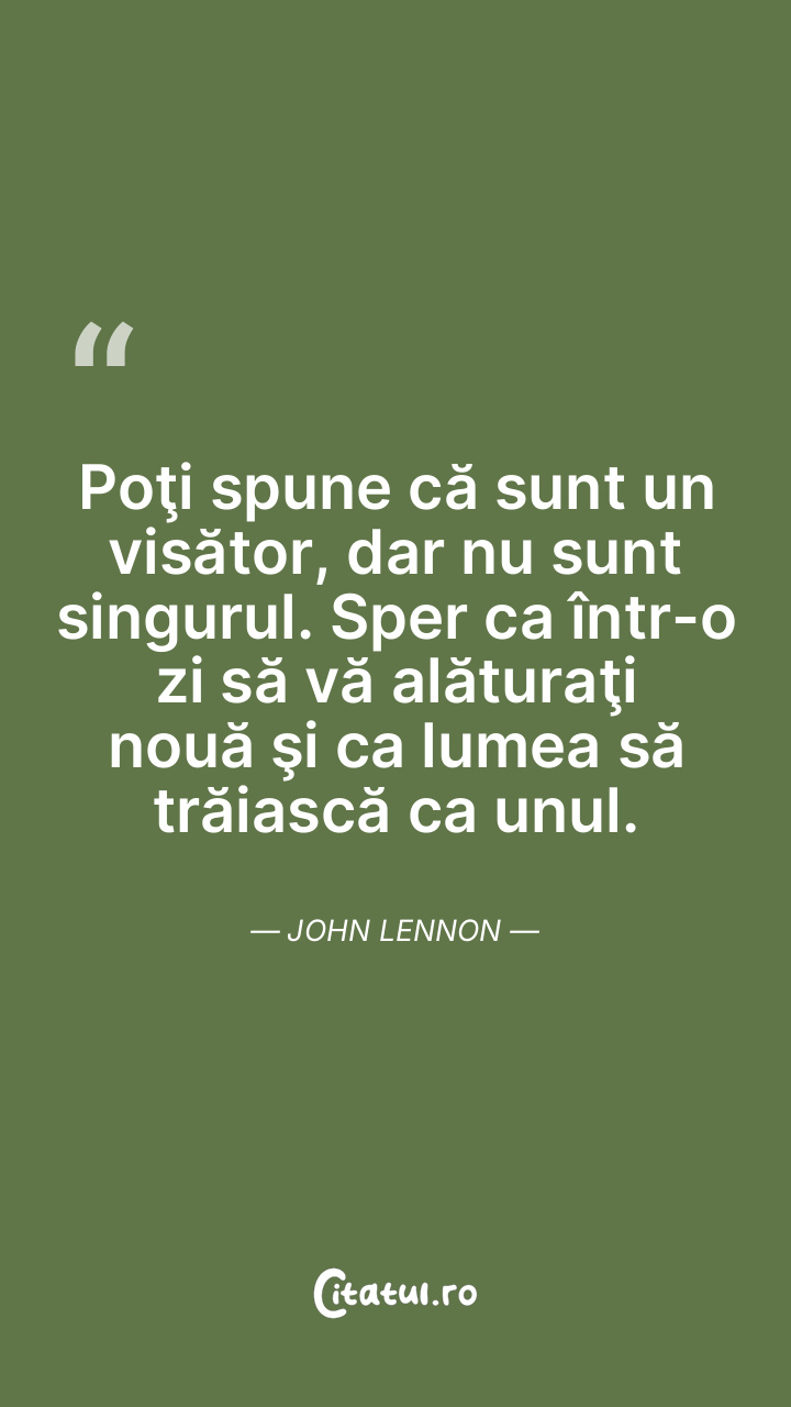 Poţi spune că sunt un visător, dar nu sunt singurul. Sper ca într-o zi să vă alăturaţi nouă şi ca lumea să trăiască ca unul. John Lennon