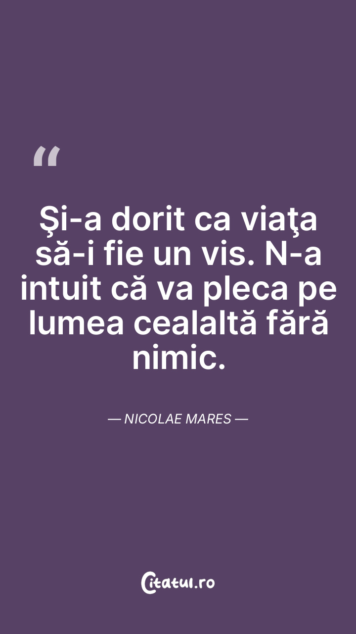 Şi-a dorit ca viaţa să-i fie un vis. N-a intuit că va pleca pe lumea cealaltă fără nimic. Nicolae Mares