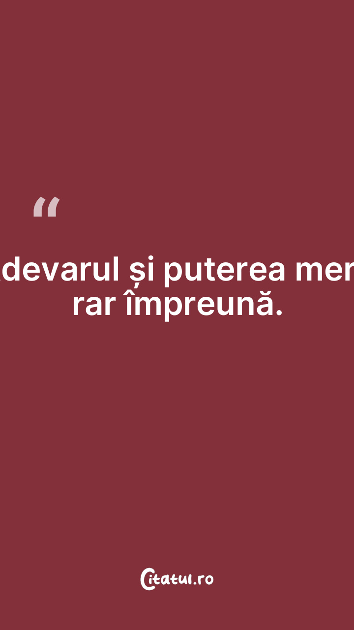 Adevarul și puterea merg rar împreună. ... Categorie: citate motivationale Dificultate: Foarte ușor de citit! Votează: ★ ★ ★ ★ ★ (0/5 din 0) Distribuiți acest citat? Alegeți platforma preferată: Salvează citatul in telefon/pc Adevarul și puterea merg rar împreună. Copiază Favorite Eroare