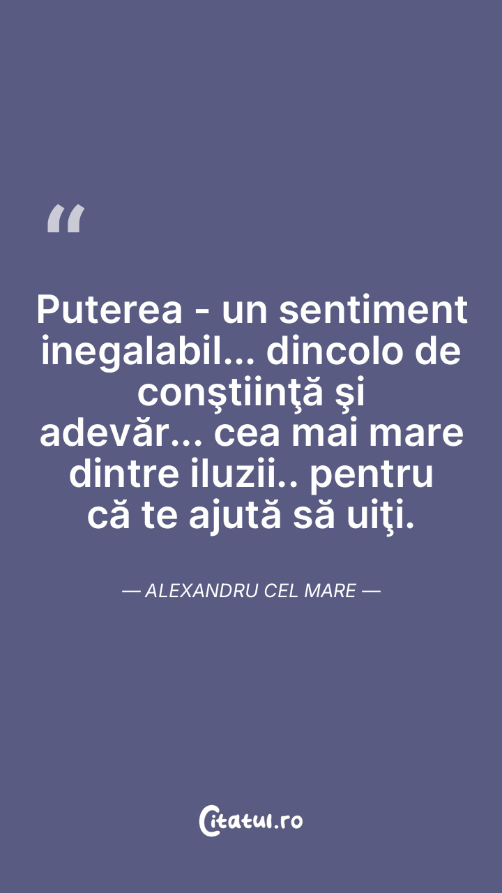 Puterea - un sentiment inegalabil... dincolo de conştiinţă şi adevăr... cea mai mare dintre iluzii.. pentru că te ajută să uiţi. Alexandru cel Mare