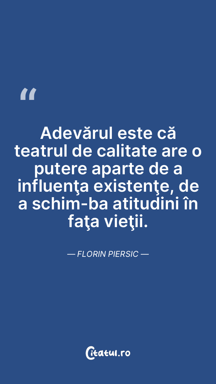 Adevărul este că teatrul de calitate are o putere aparte de a influenţa existenţe, de a schimba atitudini în faţa vieţii. Florin Piersic