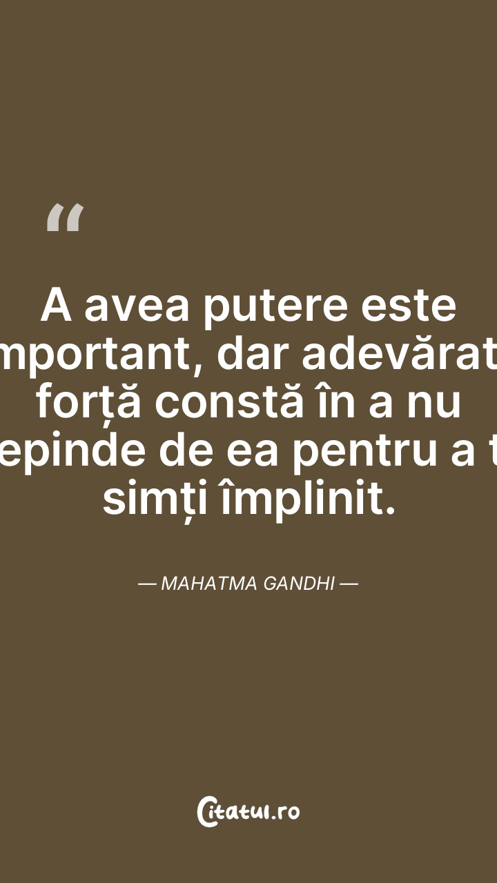 A avea putere este important, dar adevărata forță constă în a nu depinde de ea pentru a te simți împlinit. Mahatma Gandhi