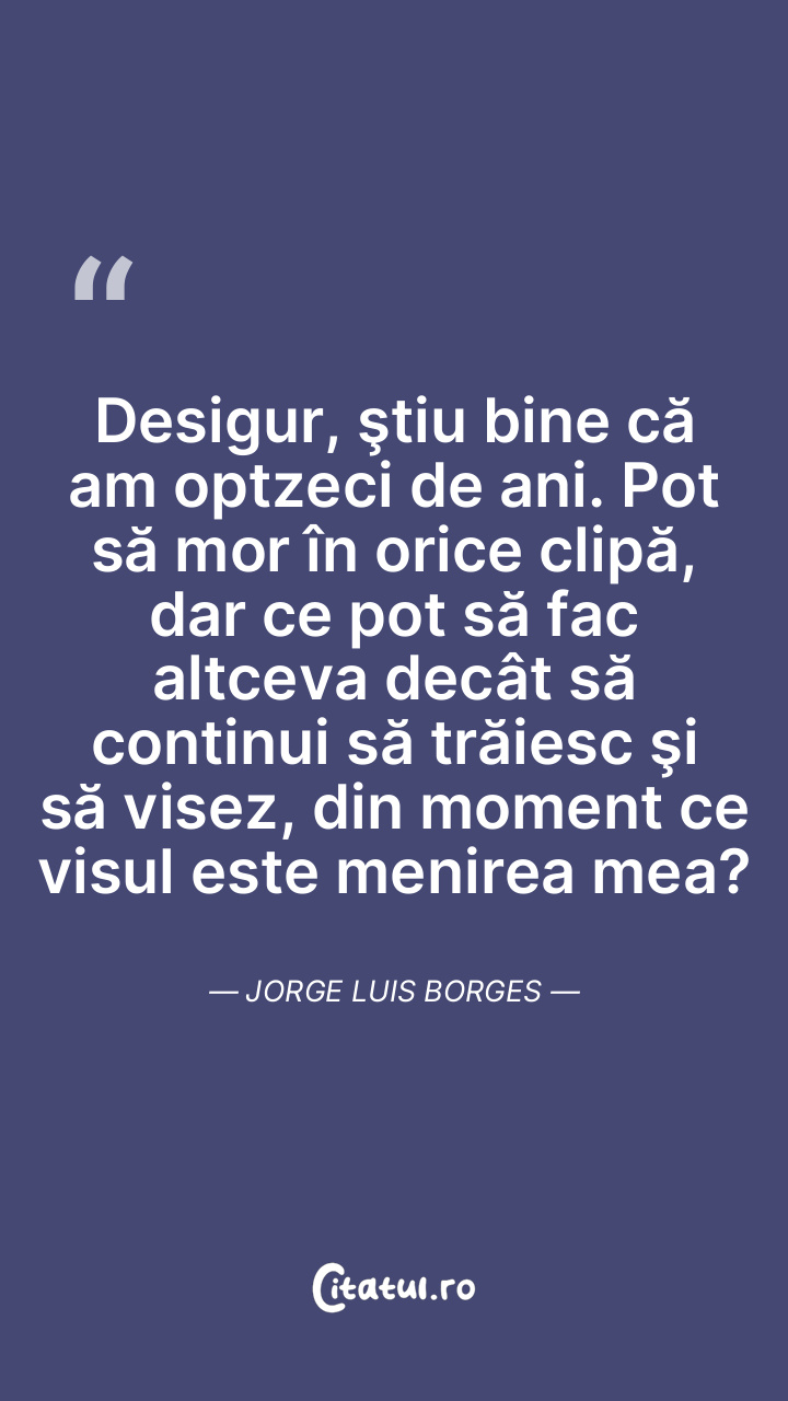 Desigur, ştiu bine că am optzeci de ani. Pot să mor în orice clipă, dar ce pot să fac altceva decât să continui să trăiesc şi să visez, din moment ce visul este menirea mea? Jorge Luis Borges
