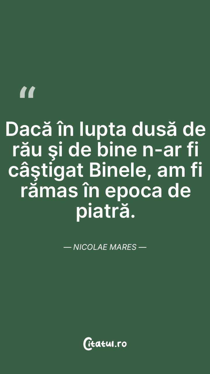 Dacă în lupta dusă de rău şi de bine n-ar fi câştigat Binele, am fi rămas în epoca de piatră. Nicolae Mares