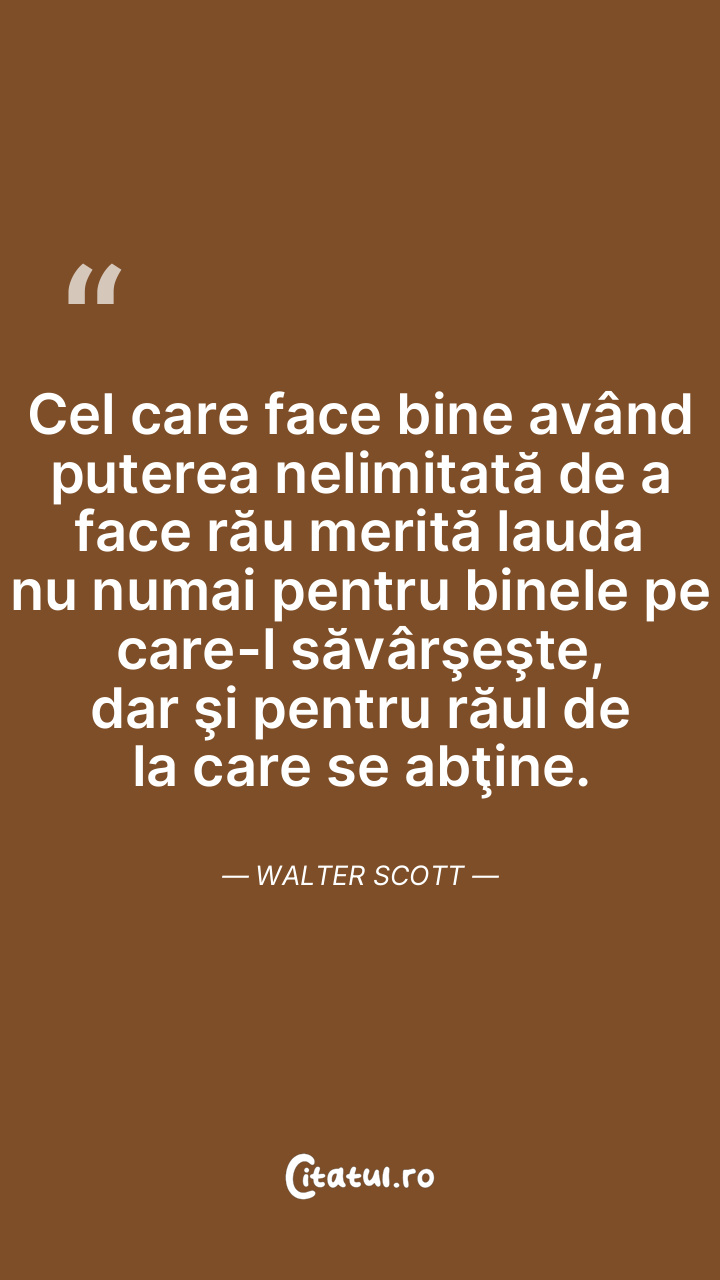 Cel care face bine având puterea nelimitată de a face rău merită lauda nu numai pentru binele pe care-l săvârşeşte, dar şi pentru răul de la care se abţine. Walter Scott