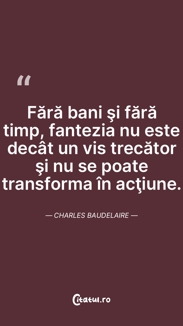 Fără bani şi fără timp, fantezia nu este decât un vis trecător şi nu se poate transforma în acţiune. Charles Baudelaire