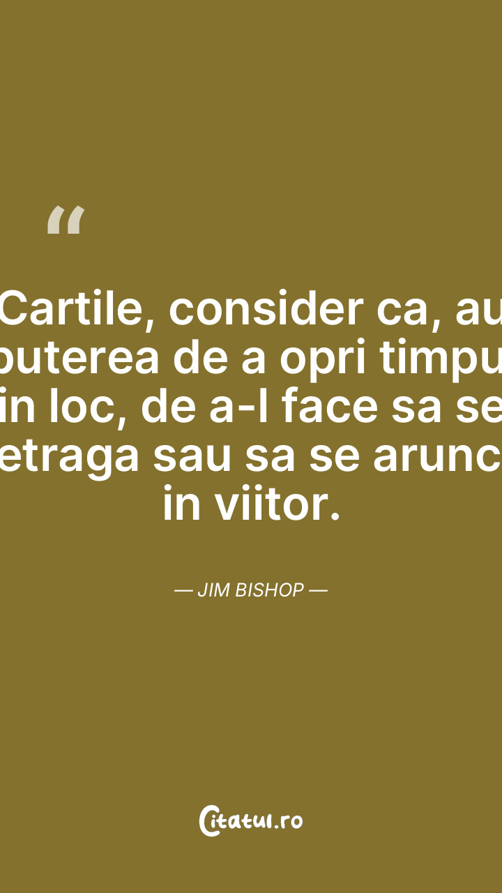 Cartile, consider ca, au puterea de a opri timpul in loc, de a-l face sa se retraga sau sa se arunce in viitor. Jim Bishop