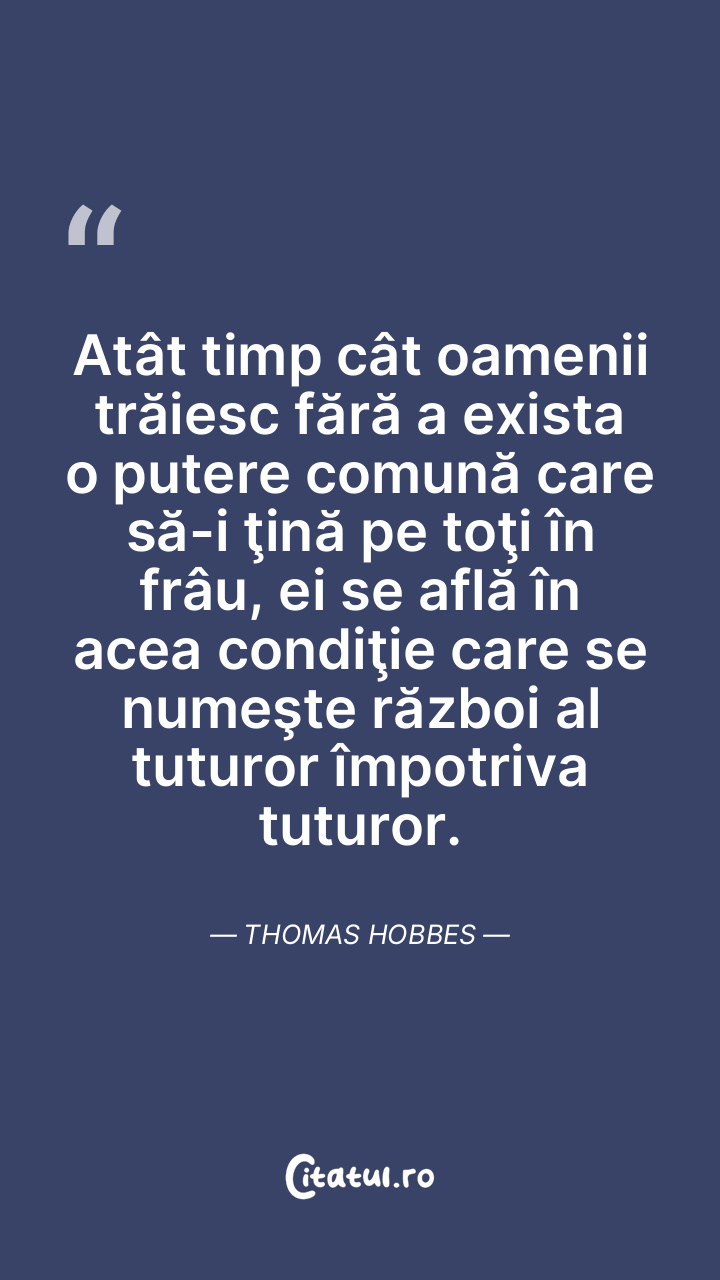Atât timp cât oamenii trăiesc fără a exista o putere comună care să-i ţină pe toţi în frâu, ei se află în acea condiţie care se numeşte război al tuturor împotriva tuturor. Thomas Hobbes