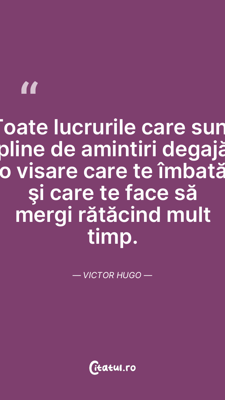 Toate lucrurile care sunt pline de amintiri degajă o visare care te îmbată şi care te face să mergi rătăcind mult timp. Victor Hugo