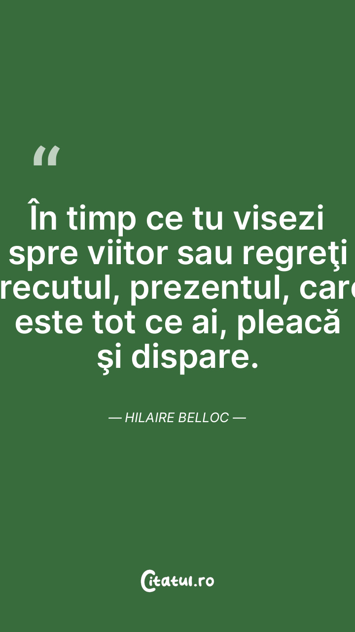 În timp ce tu visezi spre viitor sau regreţi trecutul, prezentul, care este tot ce ai, pleacă şi dispare. Hilaire Belloc