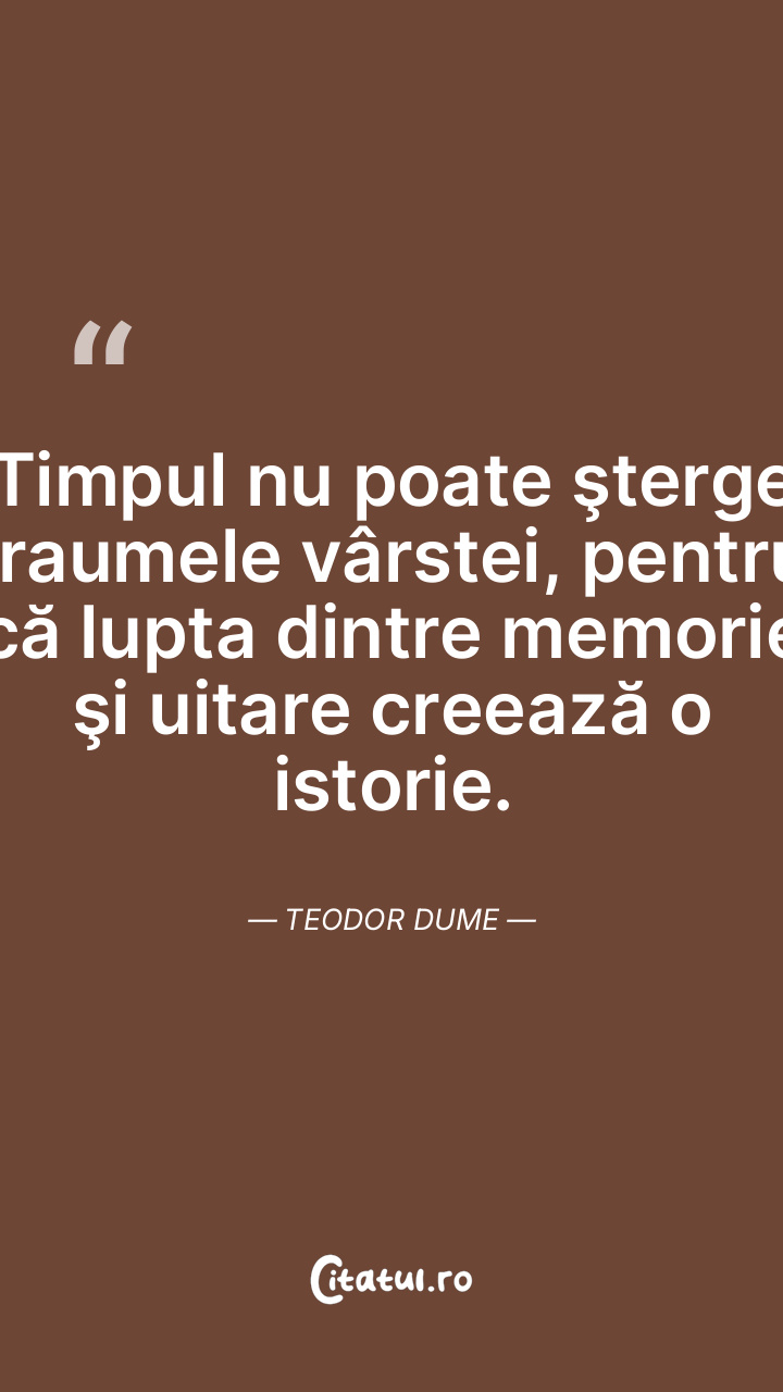 Timpul nu poate şterge traumele vârstei, pentru că lupta dintre memorie şi uitare creează o istorie. Teodor Dume