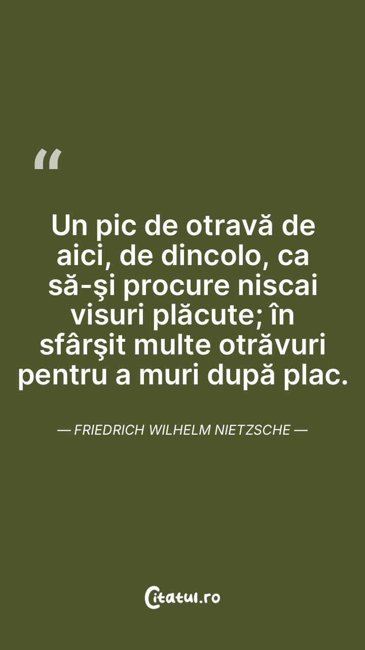 Un pic de otravă de aici, de dincolo, ca să-şi procure niscai visuri plăcute; în sfârşit multe otrăvuri pentru a muri după plac. Friedrich Wilhelm Nietzsche