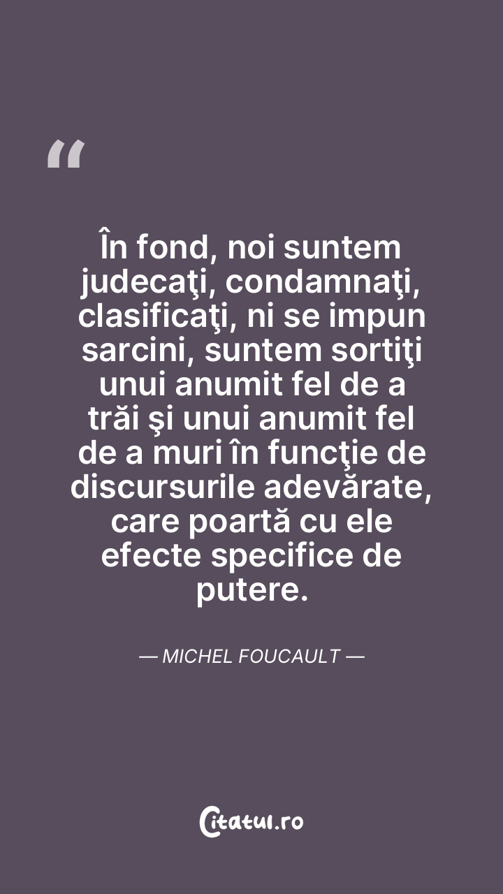În fond, noi suntem judecaţi, condamnaţi, clasificaţi, ni se impun sarcini, suntem sortiţi unui anumit fel de a trăi şi unui anumit fel de a muri în funcţie de discursurile adevărate, care poartă cu ele efecte specifice de putere. Michel Foucault